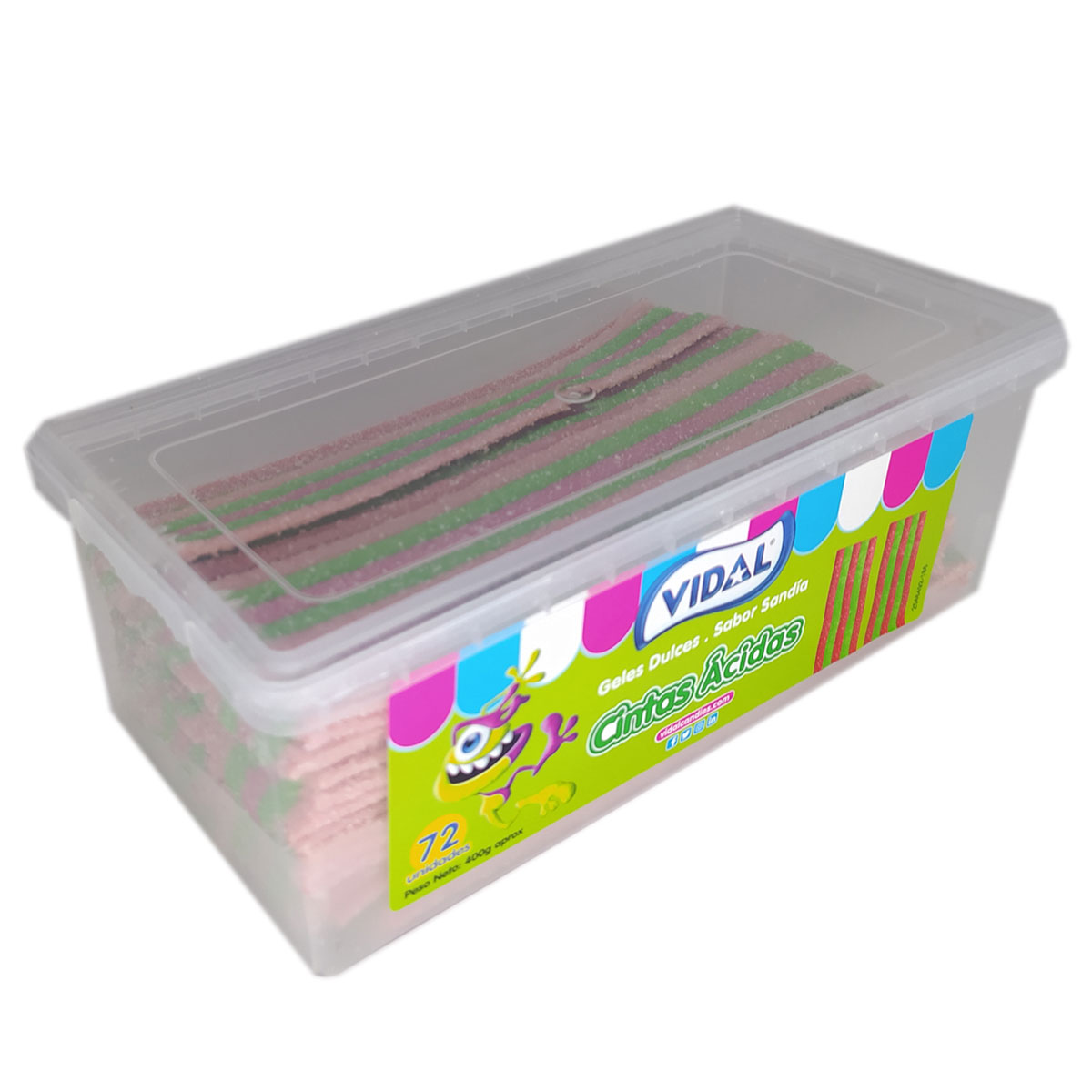 Bandejas al x mayor, Gomas Vidal¡Sumérgete en el sabor veraniego y la diversión con las Gomitas Cintas Ácidas Sabor Sandía Vidal! Cada tarrina contiene 400 gramos de estas golosinas, con 72 unidades, para que disfrutes de un dulce festín lleno de frescura.