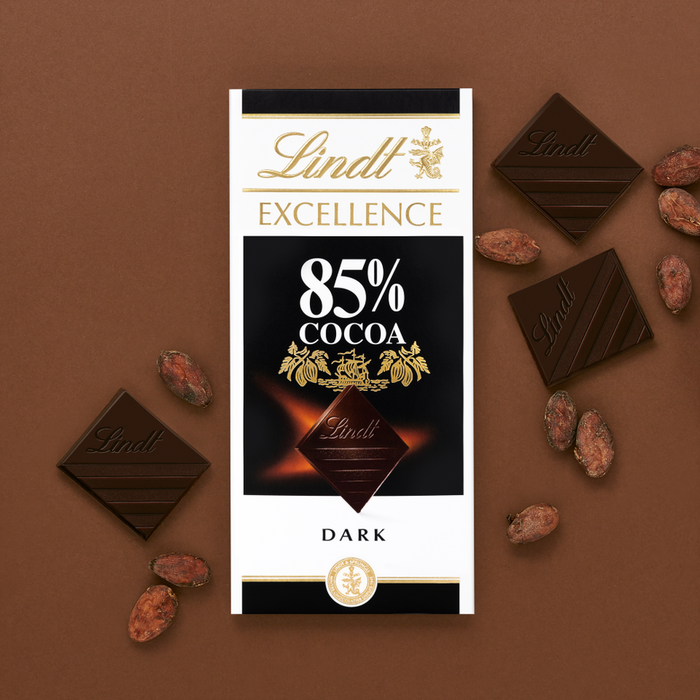 Lindt Excellence 85% es una tableta de intenso y exquisito chocolate vegano elaborado con los mejores ingredientes por nuestros Maestros Chocolateros, expertos en chocolates y bombones de alta calidad. Una mezcla perfecta de fino chocolate negro con un 85% de cacao puro que combina un aroma fuerte y un cacao de sabor intenso para crear una experiencia que satisface todos los sentidos y proporciona gran placer con su textura delicada y color profundo. Disfruta del agradable y crujiente chasquido al partir sus onzas de chocolate 85% cacao en forma de diamante y extraordinariamente finas. Aprecia su pronunciado aroma antes de sumergirte finalmente en una intensa sinfonía de sabores de cacao mientras el chocolate negro Lindt se funde en la boca.